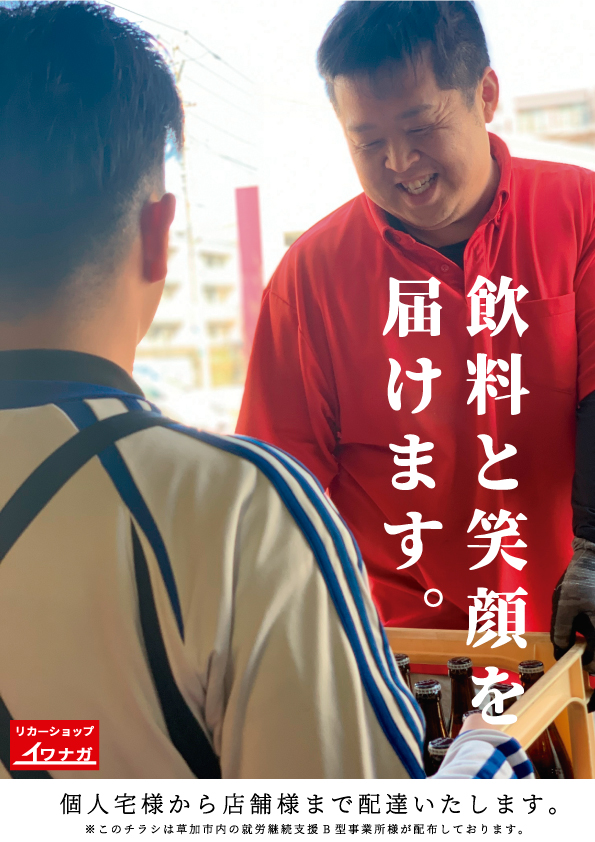 飲料提供されている、草加市のリカーショップイワナガ(㈲イワナガ)様の地域配布用のチラシのデザインと就労Bを使ったポスティング企画を担当させていただきました。