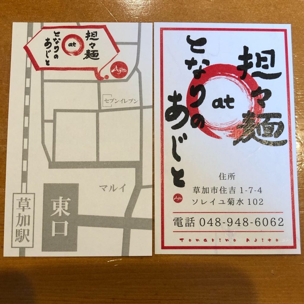 となりのあじと様2 2019.09.26GRAPHIC, PRODUCT ロゴの作成でご依頼頂いた、となりのあじと様が担々麺専門店でリニューアルするとの事で、懸垂幕・メニュー・立て看板のデザインと製作をさせて頂きました。 Tweet Share Pin it GRAPHIC, PRODUCT マルセン24様3 WAIWAI様3 関連記事一覧 まちの学校VOL.23 FLAPS様3 つけめん眞司 様 株式会社キュアコーポレーション様 Bar Cosy様 さいとう司法書士事務所様 草加商工会議所青年部様 (株)color garden 26 建築デザイン事務所... リハビリディ ねむの木様
