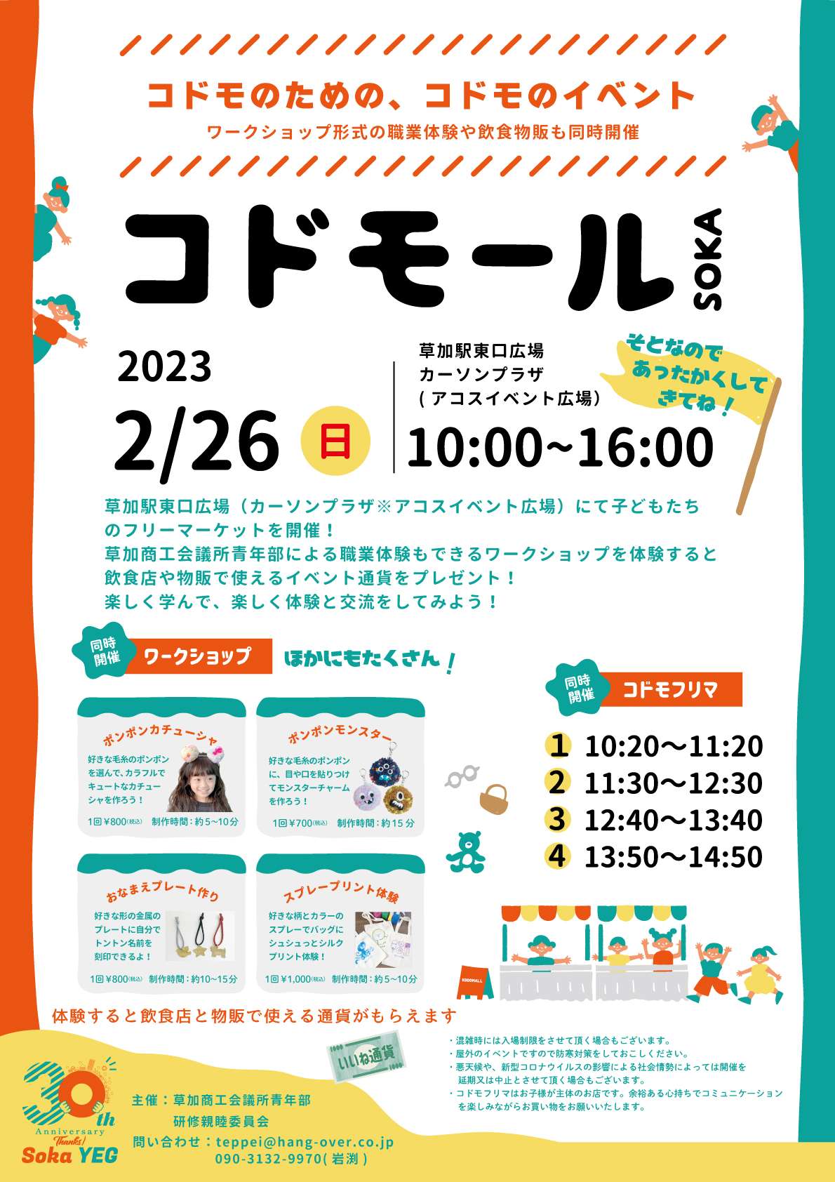 草加商工会議所青年部の事業としてコドモ―ルを企画運営いたしました。 当日は寒い中約300名の来場の方、コドモフリマでは約100名の出店者がお越しくださいました。
